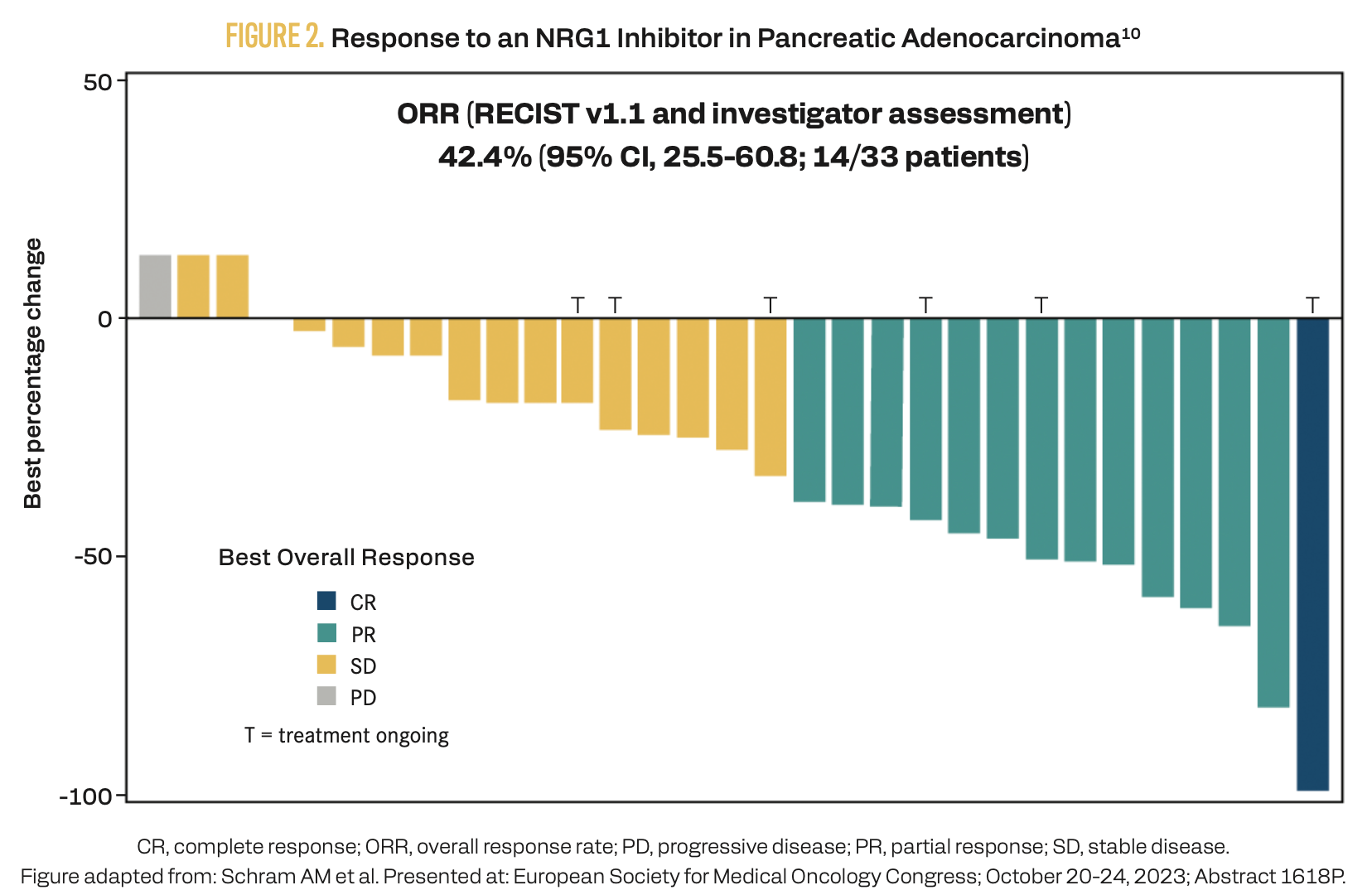 Zenocutuzumab is a HER2×HER3 bispecific antibody that inhibits NRG1 binding.8 In the phase 1/2 eNRGy trial (NCT02912949), zenocutuzumab demonstrated an overall response rate (ORR) of 30% (95% CI, 23%-37%) in 158 patients of all tumor types with NRG1 fusions.9 The response rate in 33 patients with PDAC was 42.4% (95% CI, 25.5%-60.8%), including 1 complete response and 13 partial responses (Figure 2).10 The median progression-free survival in the overall population was 6.8 months (95% CI, 5.5-9.1 months).9 The most common treatment-related adverse events (TRAEs) were diarrhea (18%), fatigue (12%), and nausea (11%). Infusion-related reactions occurred in 14% of patients. Based on results from the eNRGy study, zenocutuzumab received accelerated approval from the FDA as a second-line systemic therapy to treat advanced, unresectable, or metastatic PDAC harboring an NRG1 gene fusion.11