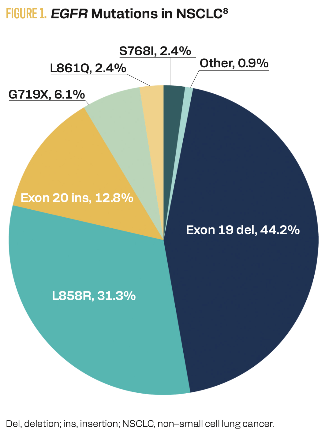 Exon 19 deletions and the L858R point mutation comprise the majority of cases of EGFR alterations in NSCLC (Figure 1).8 For patients with advanced or metastatic NSCLC harboring one of these mutations, osimertinib is an established first-line therapy based on results from the FLAURA trial (NCT02296125).9 In this study, 556 participants were randomly assigned 1:1 to receive either osimertinib or another EGFR inhibitor (gefitinib or erlotinib). Osimertinib demonstrated a statistically significant benefit in terms of both PFS (18.9 months vs 10.2 months; HR, 0.46; P < .001) and OS (38.6 months vs 31.8 months; HR, 0.80; P = .046). Similar rates of AEs were reported in both groups.