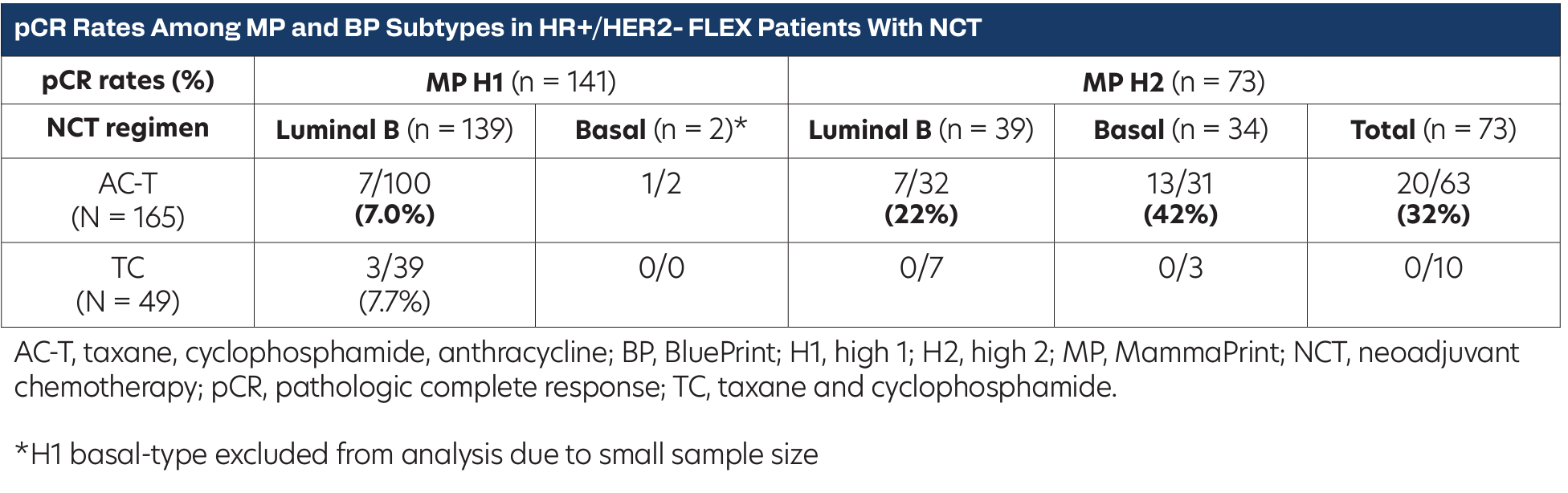 Patients with HR+/HER2–; MP high-risk tumors; treated with NCT; and enrolled in the ongoing prospective, observational FLEX trial (NCT03053193) were included (n=214). MP high-risk tumors were further classified as high 1 (H1; index 0.000 to –0.569) or high 2 (H2; index –0.570 to –1.000). BP subtypes were classified as either Luminal B-Type or Basal-Type. The associations between MP and BP, NCT regimen, and pCR outcomes were assessed.