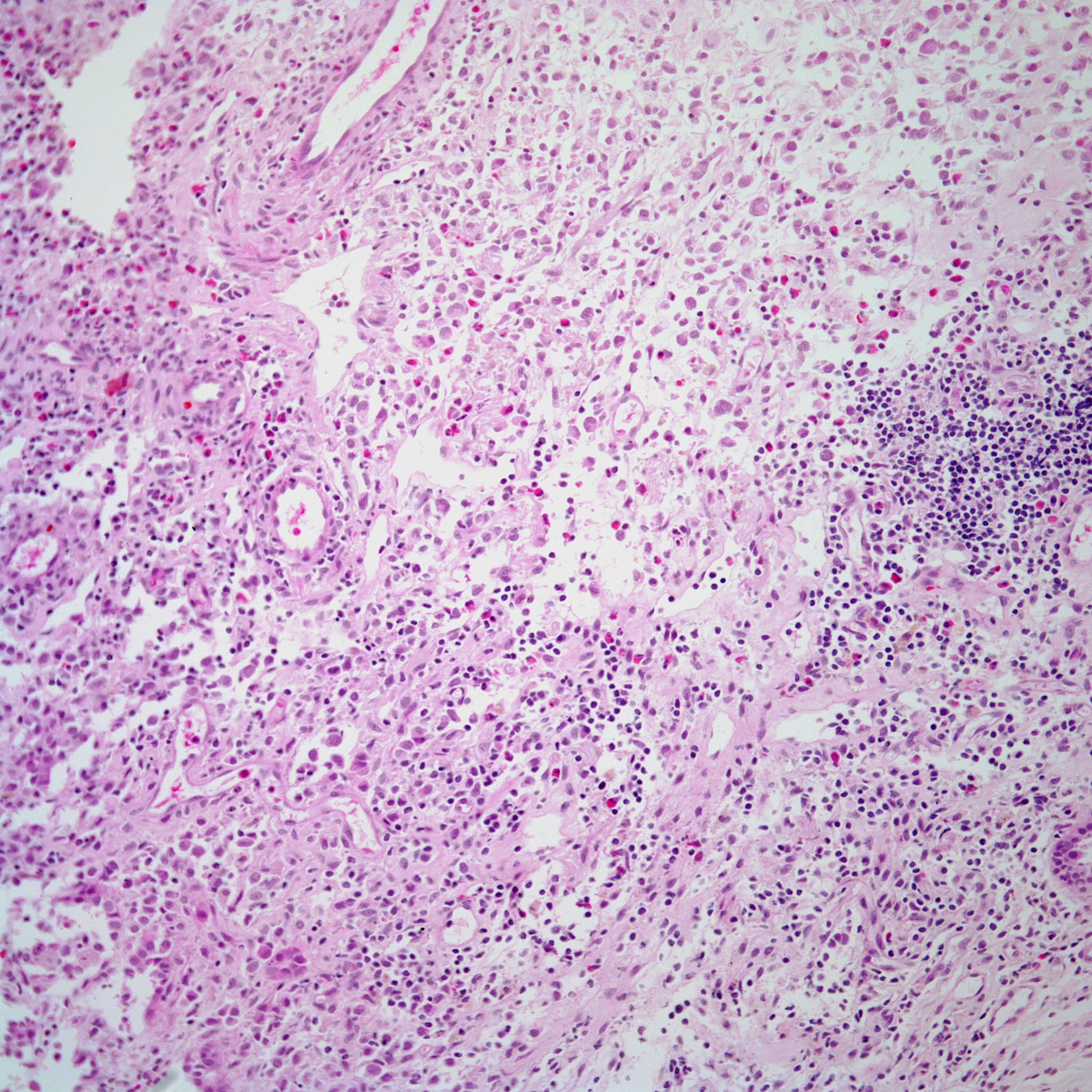 A 38-year-old woman with a history of tobacco use presents with symptoms of shortness of breath, cough, some chest pain, and general malaise. Diagnostic imaging reveals the presence of bilateral multiple pulmonary nodules. The patient denies a known history of any tumor. A surgical biopsy is obtained.