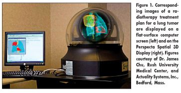 A device that displays a holograph-like 3-dimensional (3D) image, created from a CT, MRI, or PET dataset, holds promise for more accurate radiotherapy treatment planning (see image on page 1). James C. H. Chu, PhD, professor of radiation oncology, Rush University Medical Center, presented results of a pilot study of the Perspecta Spatial 3D System, developed by Actuality Systems, Inc. (Bedford, Massachusetts), at the 48th Annual Meeting of the American Society for Therapeutic Radiology and Oncology