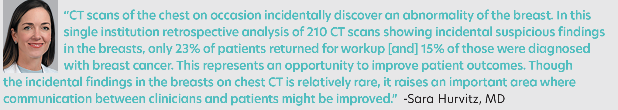 Only 23% of patients with an incidental breast finding on chest CT actually returned for recommended breast imaging indicating a significant opportunity to improve patient outcomes. Incidental breast cancer was diagnosed in 15% (7/48) of patients who underwent follow-up breast imaging as a result of a chest CT report recommendation. In this sample, the strength of recommendation characterized by CT report verbiage (absolute vs optional) did not improve follow-up adherence. Future efforts to track incidental breast findings detected on chest CT with possible referring provider and patient outreach to ensure follow-up may have greater impact on the diagnosis of previously unsuspected breast cancer.