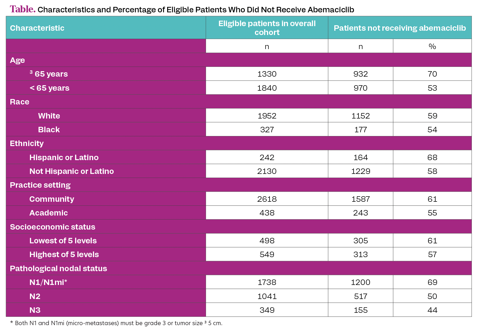 Table. Characteristics and Percentage of Eligible Patients Who Did Not Receive Abemaciclib