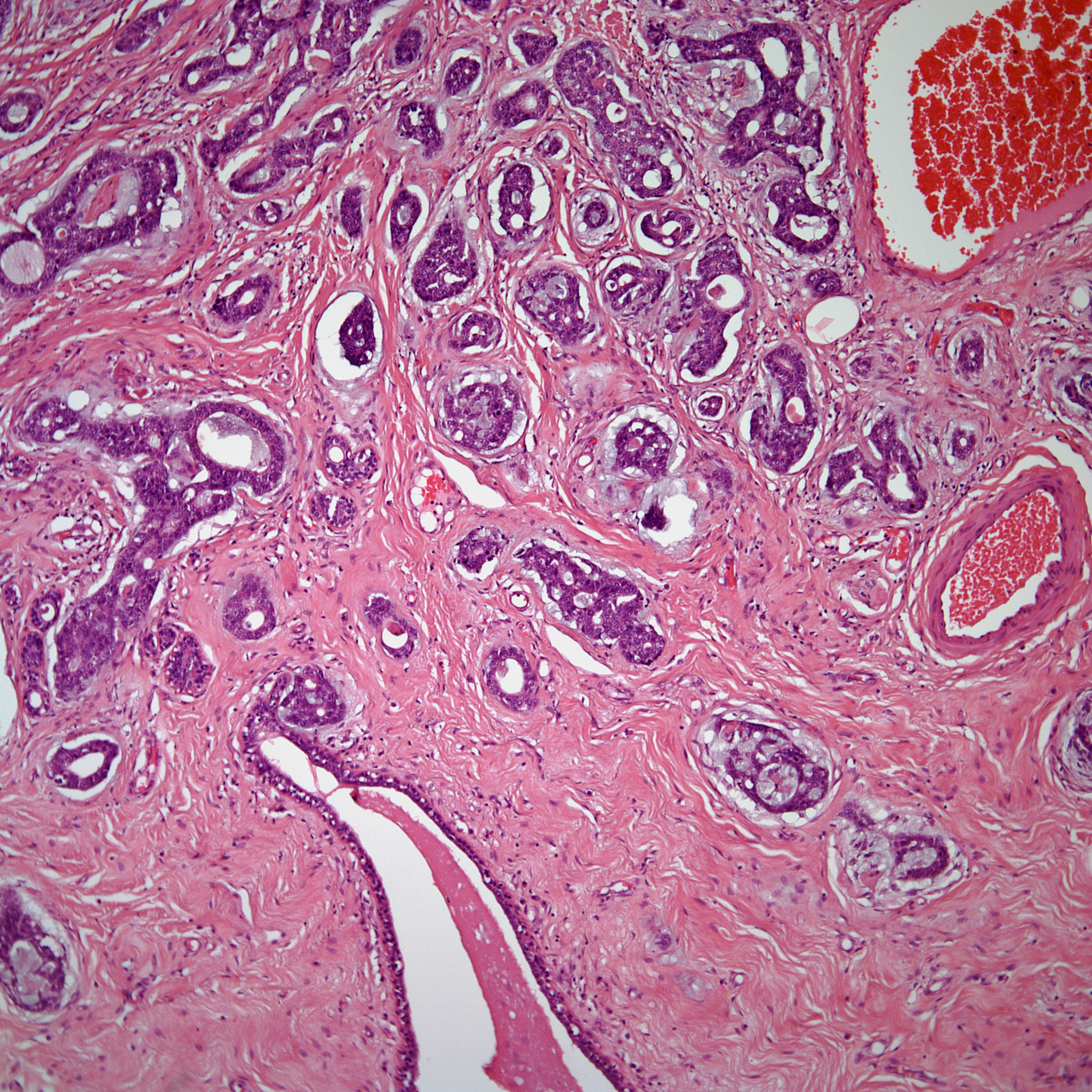 A 42-year-old woman presents with a nodule in the right breast. She states that she noted the nodule a couple of weeks ago and prior to that she was in good health. Imaging detects a breast lesion of approximately 2 cm. A lumpectomy is performed.