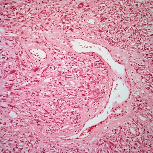 A 43-year-old man presents with a subcutaneous tumoral lesion in his right leg. Surgical resection of the tumor was performed.