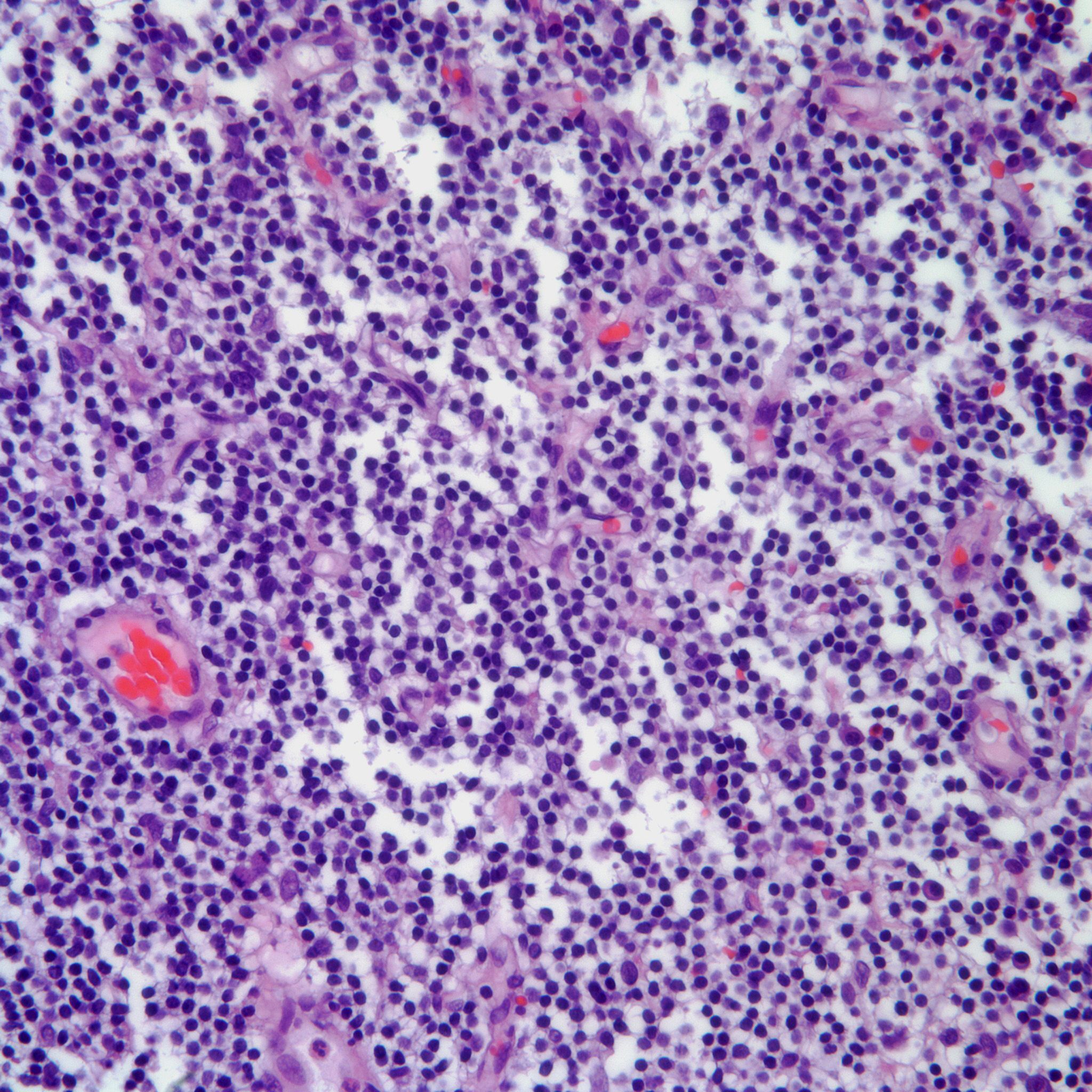 A 43-year-old woman with history of Sjogren syndrome presents with dyspnea and chest pain that she's had for a few weeks. Diagnostic imaging reveals the presence of a large anterior mediastinal mass that is described as solid and cystic. An initial biopsy is read as non-diagnostic. Surgical resection of the mass is performed.