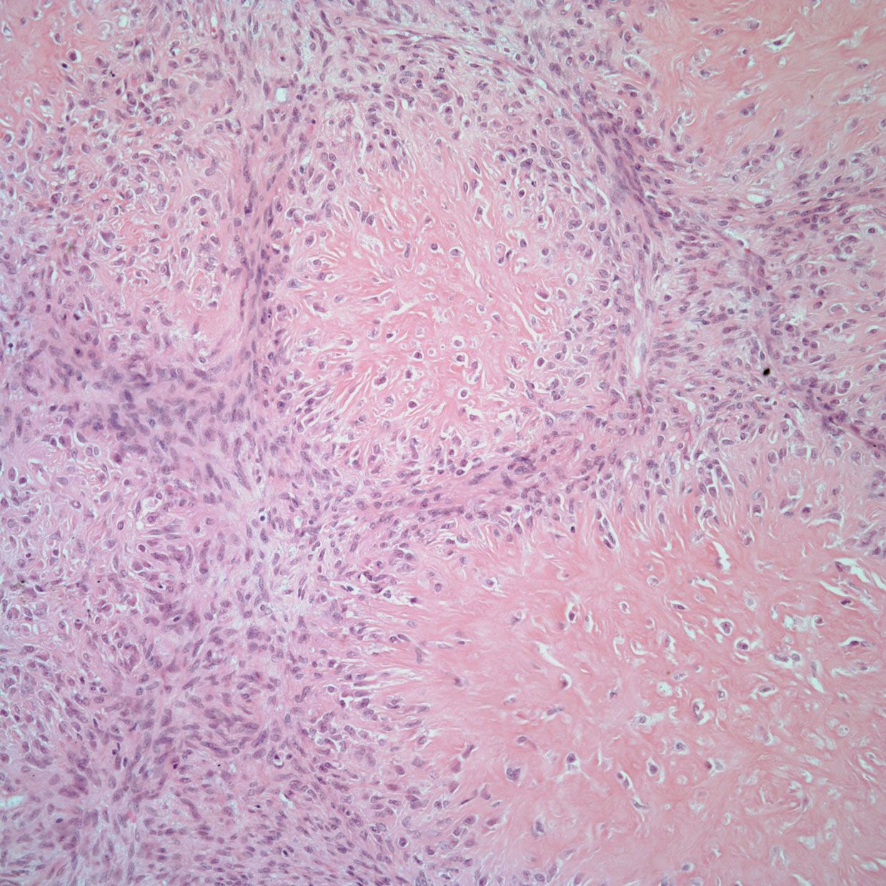 A 44-year-old man presents with a lesion on his right upper back, and a biopsy is performed.