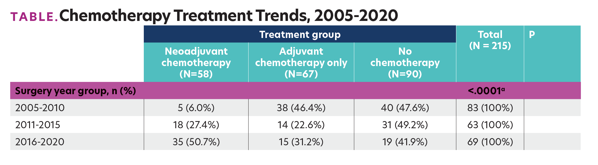 Among the 215 patients, approximately a quarter (58; 30.0%) received NAC. The mean age of those who received NAC was significantly lower (70.6 y) than of those who received only adjuvant chemotherapy (72.1 y) or no chemotherapy (76.7 y; P <.001). Those treated with NAC had a significantly larger tumor size (4.3 cm; P <.001) and a higher proportion of locally advanced and advanced stage disease (86.3%; P <.001) than those who received only adjuvant or no chemotherapy. From 2005 through 2020, the proportion of elderly patients receiving neoadjuvant chemotherapy significantly increased, from only 6% receiving NAC in 2005 through 2010, to 50.7% of patients in 2016 through 2020 (Table; P <.0001). This increase was independent of patient age and tumor stage (odds ratio [OR], 11.1; 95% CI. 3.1-39.4; P <.001 for 2011-2015 vs 2005-2010, and OR, 27.7; 95% CI, 8.1-95.3; P <.001 for 2016-2020 vs 2005-2010 reference group). Changes in the chemotherapeutic agents used also occurred over this period, with a significant decrease in the usage of anthracycline from 2005 through 2010 (18.6%) compared with 2016 through 2020 (0.0%; P <.0001). There was no significant difference in hospitalization or chemotherapy dose reduction rates in patients receiving NAC compared with those who received only adjuvant chemotherapy.