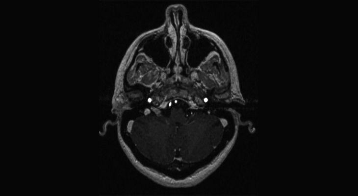 A healthy 45-year-old woman undergoes an MRI for persistent headaches. The headaches resolve with conservative management. However, there is an incidental finding on the MRI of a homogeneously enhancing mass in the right jugular foramen.