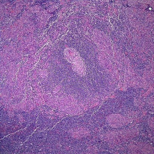 A 48-year-old man presents with dyspnea and cough. Imaging shows an anterior mediastinal mass, and resection of the mass is performed.