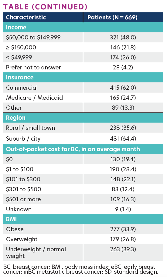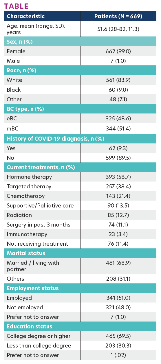 Of the 669 patients, the mean age was 51.6 years (range, 28–82), 83.9% were White, 99.0% were female, and 51.4% had metastatic BC (mBC). A total of 62 (9.3%) reported ever being diagnosed with COVID-19. The mean ± SD COST score was 22.7±10.8. The COST scores were significantly higher in patients with early BC (eBC) than mBC (24.2±11.3 vs 21.3±10.2; P <.001). COST scores did not significantly differ by COVID-19 diagnosis history (21.3±9.8 vs 22.9±10.9; P = .263). Using the FT grading cutoff, patients with mBC were more likely to experience FT (no FT, 33.7%; mild FT, 42.2%; moderate/severe FT, 24.1%) than patients with eBC (no FT, 48.3%; mild FT, 31.1%; moderate/ severe FT, 20.6%; P ≤ .001). No significant differences in the prevalence of FT were observed across racial groups or between patients with/without COVID diagnosis history. The Table shows key patient characteristics and FT.