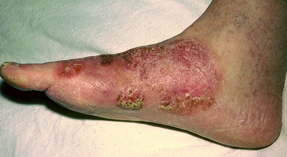 A 51-year-old man slowly developed a 15 cm × 8 cm erythematous, notably indurated, and variably scaly plaque located on the medial and dorsal aspect of the right foot. By the time he sought medical attention, this minimally pruritic lesion had been present about 2.5 years. The rest of the cutaneous examination was unremarkable. Ipsilateral inguinal adenopathy was not detected. Several skin biopsies showed a similar pattern, consisting of hyperkeratosis and acanthosis accompanied by an intraepidermal clonal infiltrate of CD8+ atypical lymphocytes with pleomorphic nuclei, and a dense upper dermal infiltrate composed of more benign-appearing lymphocytes.