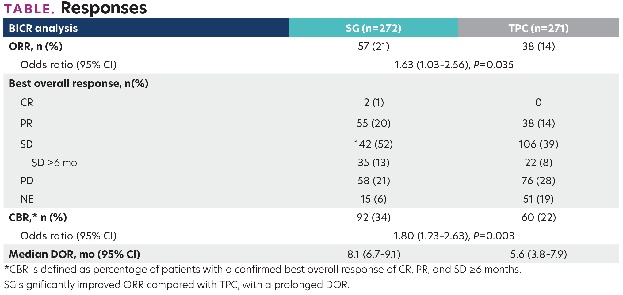543 pts were randomized to receive SG (n = 272) vs TPC (n = 271). Pts had a median of 3 prior CTs for mBC, and 95% had visceral metastases. At data cutoff on July 1, 2022 (median follow-up, 12.5 mo), 390 OS events had occurred. SG significantly improved OS (median 14.4 vs 11.2 mo; HR, 0.79; P = .020), ORR, global health status/QoL, and fatigue vs TPC (Table). The safety of SG was consistent with prior reports, with no new safety signals identified.