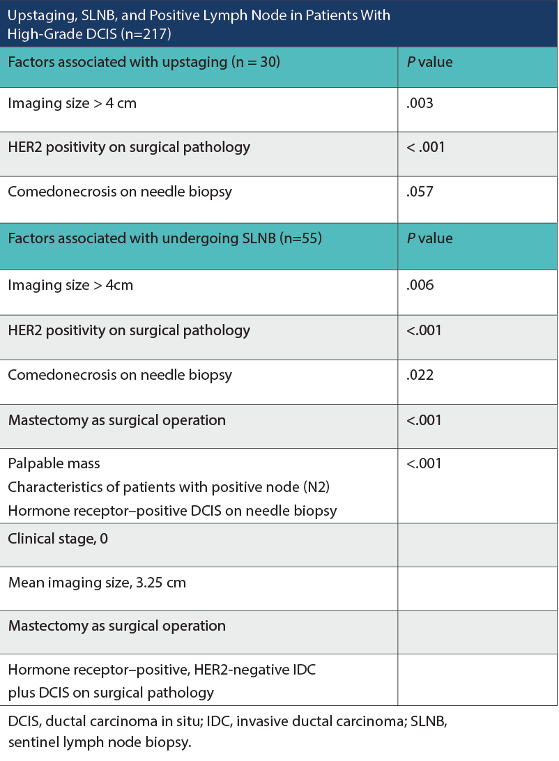Two hundred and seventeen patients were analyzed. Thirty patients (13.8%) upstaged on final pathologic assessment. Twenty-seven patients upstaged to pathologic stage IA and 3 patients to stage IIA. Factors associated with upstaging included imaging size greater than 4 cm (P = .003) and surgical pathology indicating HER2 positivity (P < .001). Comedonecrosis on needle biopsy, as a predictor of upstaging, approached but did not meet statistical significance (P = .057). Fifty-five patients (25.3%) underwent SLNB. Notable factors associated with undergoing SLNB included comedonecrosis on needle biopsy (P = .022), palpable mass (P < .001), imaging size greater than 4 cm (P = .006), surgical pathology indicating HER2 positivity (P <.001), and mastectomy as the surgical operation (P < .001). Two patients (3.6%) who underwent SLNB had a positive lymph node. Both of these patients’ core needle biopsies demonstrated estrogen and progesterone receptor–positive DCIS, clinical stage 0, with a mean imaging size of 3.25 cm. Neither had a palpable mass. Both patients underwent mastectomy with final pathology showing hormone receptor–positive, HER2-negative invasive ductal carcinoma along with DCIS. Of the 24 patients with core needle biopsies demonstrating microinvasive disease, none had positive sentinel lymph nodes. No axillary recurrences or lymphedema were observed.