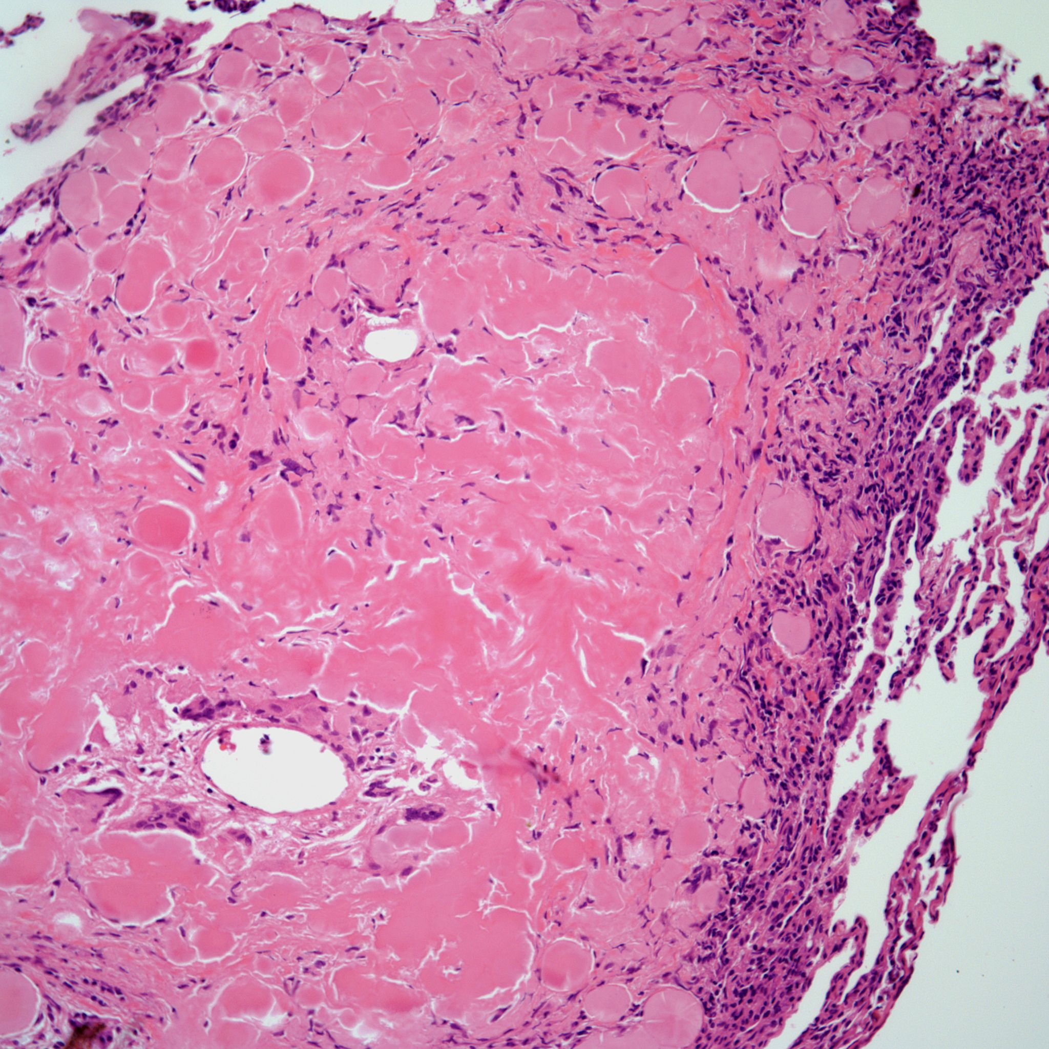 A 53-year-old man comes in with a cough, chest pain, and dyspnea that he’s had for several weeks. Radiographic imaging of the chest reveals a mass lesion in the right lower lobe.