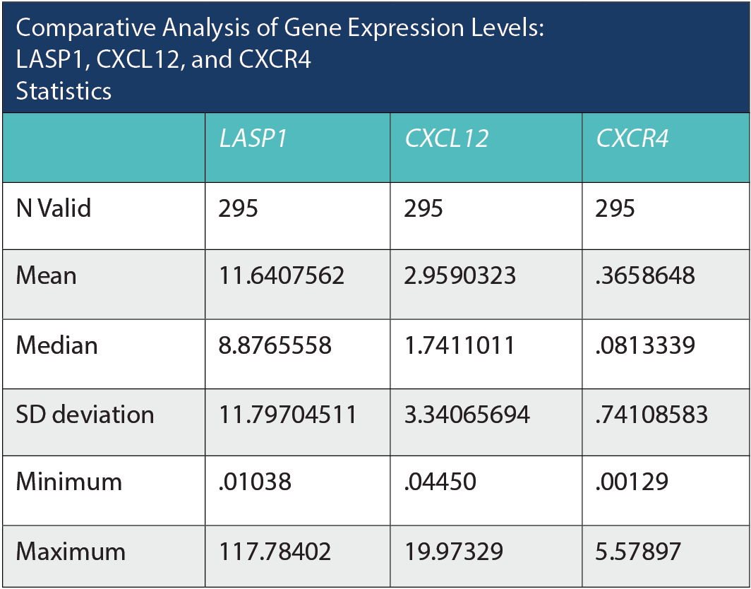 Comparative Analysis of Gene Expression Levels: LASP1, CXC12, and CXCR4 Statistics