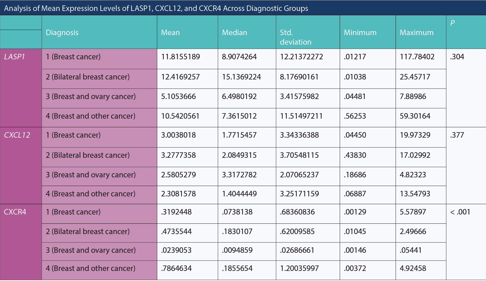 The table below examines whether there are significant differences in the means of LASP1, CXCL12, and CXCR4 among diagnosis groups, providing descriptive statistics and P values. Upon reviewing the table, no significant differences were observed among diagnosis groups in terms of mean LASP1 and CXCL12 (P = .304; P = .377, respectively). However, there was a statistically significant difference among diagnosis groups in terms of mean CXCR4 (P < .001). Upon detailed analysis of the differences, for CXCR4, the mean of diagnosis group 3 was significantly lower than groups 1, 2, and 4 (P = .046; P = .005; P = .002, respectively). The mean of group 1 for CXCR4 was significantly lower than groups 2 and 4 (P = .026; P = .002, respectively). There was no statistically significant difference between diagnosis groups 2 and 4 in terms of mean CXCR4 (P = .565).