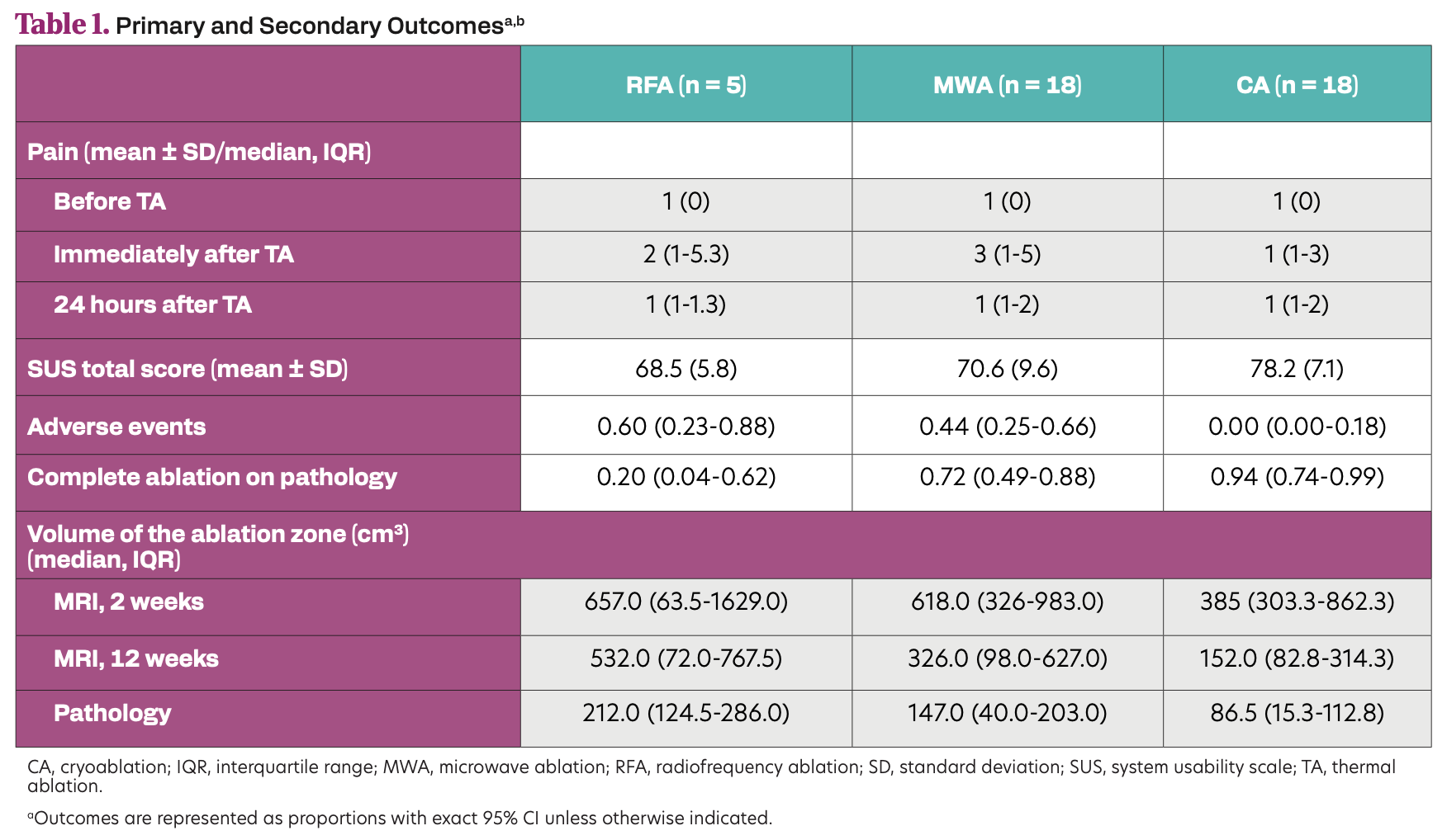 A total of 41 patients were included. Treatment in the RFA arm was terminated prematurely due to reaching a protocol defined stopping rule after 5 inclusions. Eighteen patients were treated with MWA and CA. All techniques were user-friendly and showed excellent feasibility in an outpatient setting. Complete ablation was reached in 72% (95% CI, 49%-88%) in the MWA arm and in 94% (95% CI, 74%-99%) in the CA arm. AEs occurred in 44% (95% CI, 25%-66%) and 0% (95% CI, 0%-18%) of patients in the MWA and CA arms, respectively.