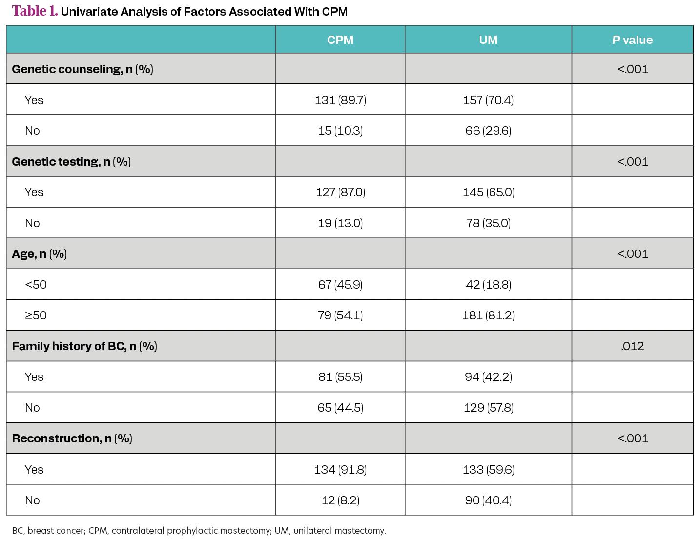 Of 369 patients, 223 (60.4%) underwent UM, while 146 (39.6%) chose CPM. Overall, 288 (78.0%) of patients in our study group received pGC. Of those managed with CPM, 89.7% had pGC as compared with 70.4% of patients who had UM (P <.001). Most counseled patients had genetic testing sent prior to surgery (94.4%). Patients who underwent CPM were also more likely to have had genetic testing than those managed with UM (87.0% vs 65.0%, P <.001). Younger patients were more likely to elect CPM; of 109 patients aged < 50, 67 (61.5%) had CPM while of the 260 patients aged ≥ 50, only 79 (30.4%) chose CPM (P <.001). Self-reported positive family history of breast cancer (FHx) was also associated with CPM, with 55.5% of those undergoing CPM reporting FHx compared with 42.2% for UM (P = .012). Most patients in our study had reconstruction (72.4%). Patients managed with CPM were more likely to have reconstruction (91.8% vs 59.6%, P <.001) (Table).