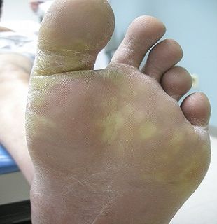 A 60-year-old man presents with localized tender plaques of hyperkeratosis and a surrounding erythematous halo on the weight-bearing plantar aspect of his feet after beginning cancer treatment.