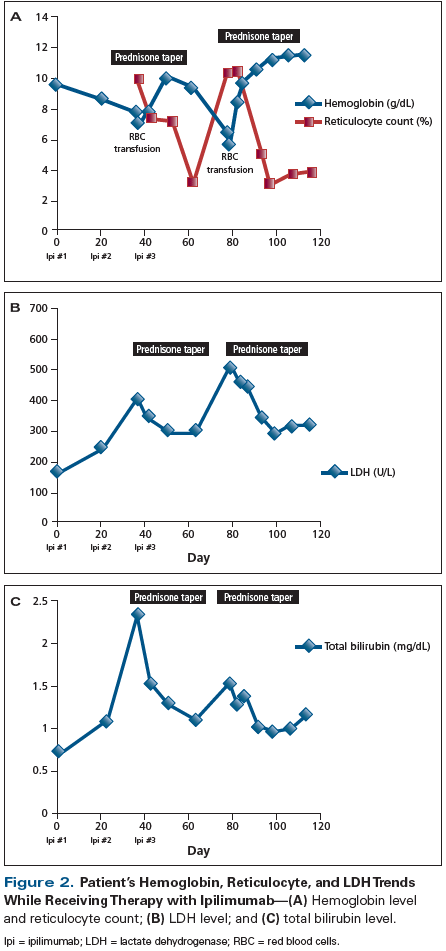 Treatment with ipilimumab was held and the patient was started on prednisone, 1 mg/kg daily, and 2 units of transfused red blood cells. Within 12 days of starting prednisone, his hemoglobin level increased to 10.1 g/dL, his reticulocyte count decreased to 7.2%, and his LDH and total bilirubin levels fell to 338 U/L and 1.3 mg/dL, respectively (Figure 2). His prednisone was tapered over 21 days, and once the taper was complete, he received a third dose of ipilimumab. Fifteen days after his third dose of ipilimumab his hemoglobin again dropped-this time to 6.4 g/dL-while his LDH level rose to 578 U/L. Prednisone at 1 mg/kg daily was resumed and ipilimumab was permanently discontinued. Treatment with corticosteroids resulted in a rapid response in our patient, and he was successfully weaned off the steroids after permanent discontinuation of ipilimumab. Thirty-five days after his last dose of ipilimumab his hemoglobin had increased to 11.6 g/dL.