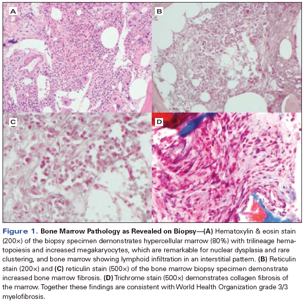 A 60-year-old man with a history of coronary artery disease and JAK2 V617F–positive polycythemia vera presented to our bone marrow transplantation clinic with progressive fatigue, splenomegaly, and cytopenias. He had been in good health up until 14 years prior, when he was found to have polycythemia on routine blood work. He was treated with low-dose aspirin and serial phlebotomies for many years without complications. However, he eventually developed worsening thrombocytosis that required treatment with hydroxyurea and anagrelide. A bone marrow biopsy was performed; this demonstrated post–polycythemia vera myelofibrosis, World Health Organization grade 3/3, with 80% cellularity and 2% blasts. Cytogenetics revealed deletion of chromosome 20q. JAK2 V617F mutation testing was performed, and the patient was found to harbor this mutation. Treatment with ruxolitinib was initiated, which within 2 months resulted in resolution of his splenomegaly and improvement in his anemia. However, 1 year later, he developed progressive fatigue, splenomegaly, and worsening anemia, and he was referred for evaluation for hematopoietic stem cell transplantation.