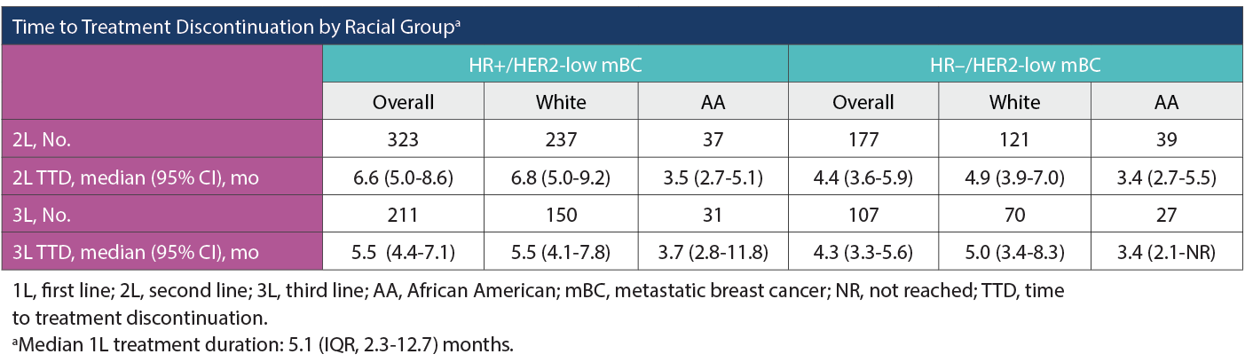 Within a median follow-up of 11.2 months (IQR, 6.3-17.9) from 2L initiation, 76% of patients who were AA patients (n = 58)and 61% of patients who were White (n = 220)with HER2-low mBC moved to the third-line (3L). The median TTD in the 2L and 3L settings was shorter for AA vs White patient groups regardless of HR status.