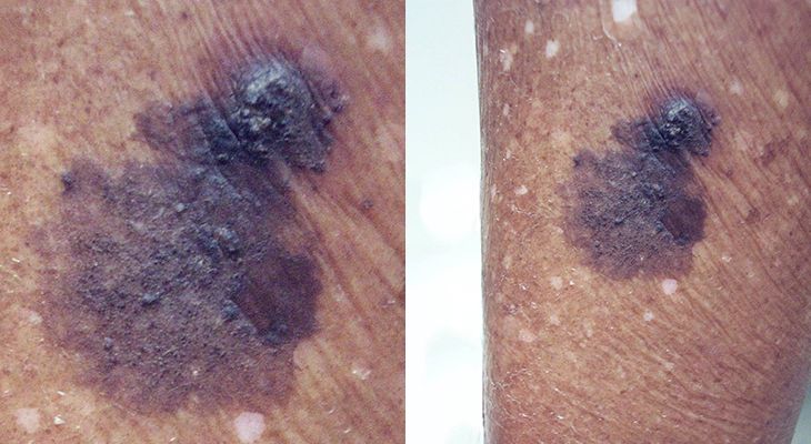 A 67-year-old African American female presented with an approximately 18-month history of a solitary, asymptomatic lesion on the right leg. The patient's medical history was benign, and a review of systems only disclosed symptoms consistent with untreated menopause. The patient specifically denied trauma and local heat applications to the affected area. General physical examination was unremarkable with the singular exception of the irregularly shaped, darkly pigmented, slightly rough and scaly, 10 cm × 6.5 cm patch on the right foreleg. There was a 1.2 cm × 1.3 cm nodular component located in the superior pole of the lesion. Incidental note was made of innumerable small, hypopigmented macules scattered randomly from the ankles to the thighs bilaterally. There was no palpable inguinal adenopathy, and a recent routine laboratory panel disclosed very mild anemia and mild fasting hyperglycemia. A chest x-ray was normal.