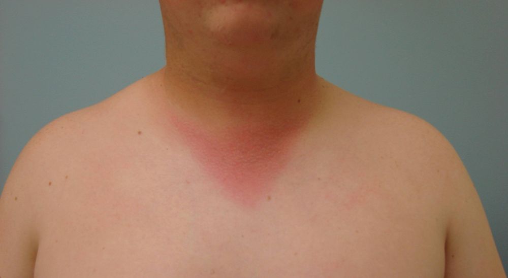 A 67-year-old Caucasian male presents in the month of April with a spontaneously painful and tender-to-the-touch erythema involving the face, dorsal and distal forearms, dorsal hands, and V-area of the neck/anterior chest. He has cancer and is being treated with one or more chemotherapeutic agents.