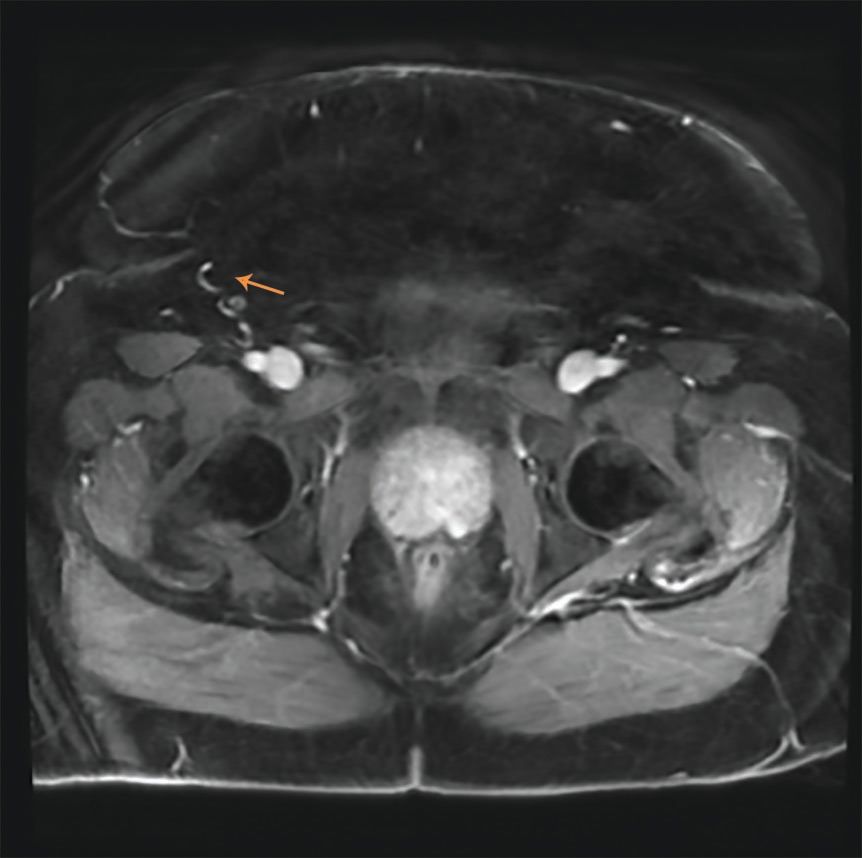 • Pelvic imaging and review of pathology should be obtained to further characterize the tumor.