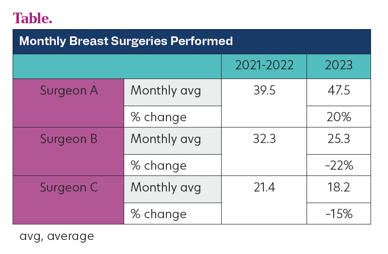 A total of 1665 patient records were analyzed (Table). Post MT adoption, surgeon A saw an increase in monthly breast surgical volume by 8 additional surgeries (47.5 in 2023 vs 39.5 in 2021-22, P = .0882). Surgeons B and C observed a decrease in volumes (surgeon B, 25.3 patients vs 32.23, P = .0133; surgeon C, 18.2 vs 21.4, P = .2468). Surgeon A experienced a reduction in the average time from referral to surgery by 11 days (from 80 to 69 days). The cost analysis revealed that MT was $656.65 per patient whereas the average Tc99 cost was $854.66 and isosulfan blue (BD) was $979.73. Per-patient cost savings were $198.01 when compared with Tc99 alone and $1177.74 when compared with Tc99 and BD.