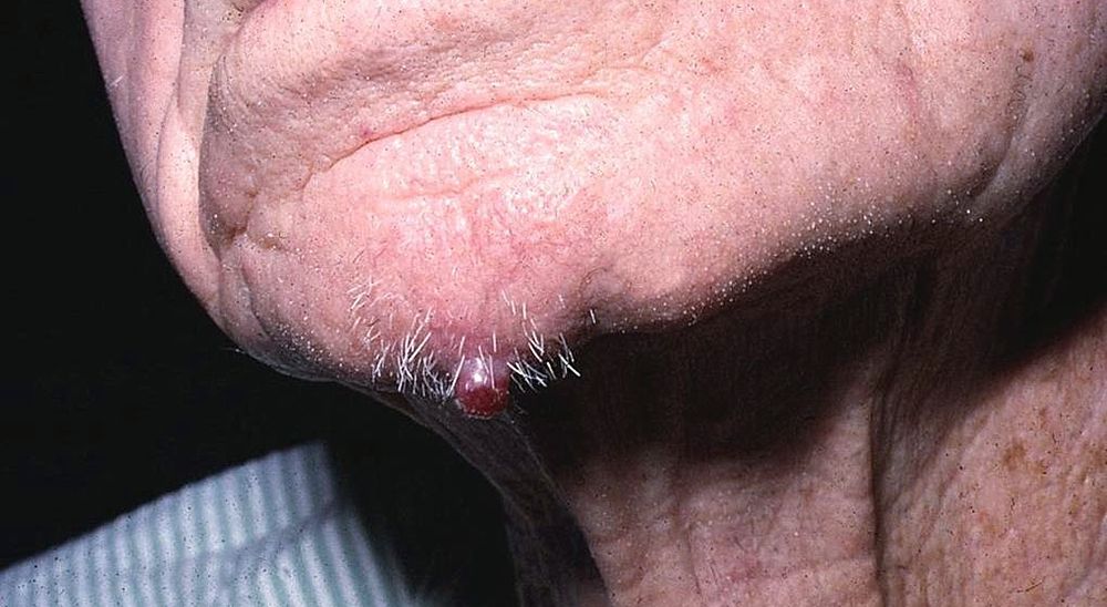 A 71-year-old, previously healthy man presents for evaluation of a new, solitary, painless, pedunculated bump on his chin. Past medical history is negative for surgery or transfusion, and he denies intravenous drug use. His review of systems is negative with the exception of complaints about mild right-sided postero-lateral flank pain.