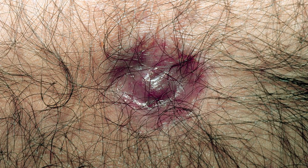 A 74-year-old, previously healthy, nonsmoking Caucasian male presented with a 4-month history of an asymptomatic “lump” in the navel. Review of systems revealed an involuntary 17-pound weight loss during the previous 6 months and intermittent localized abdominal pain of mild to moderate severity. Recent routine laboratory values and chest radiograph were within normal limits. A carcinoembryonic antigen (CEA) level was 55 ng/mL (severely elevated). A fecal occult blood test was positive. Physical examination disclosed a firm 3.5 cm × 3 cm violaceous nodule occupying the central umbilicus, surrounded by a narrow rim of similarly colored, indurated periumbilical skin. Biopsy of the umbilical nodule revealed adenocarcinoma.