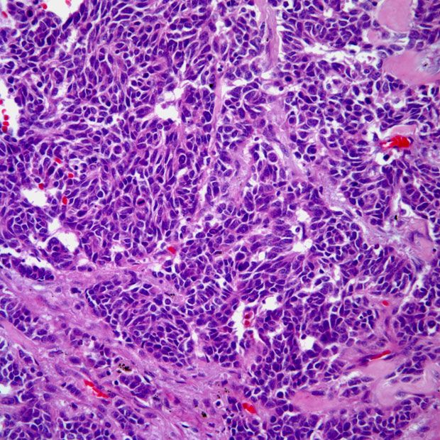 A 78-year-old man presents with a cough and history of weight loss of several weeks' duration. Chest imaging reveals the presence of an intrapulmonary mass.