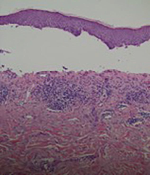 A 79-year-old white man presented with an ulcerated chest wall lesion developing from an existing mole. After definitive surgery, it proved to be a malignant melanoma and staged as T4N1M0. He received 1 year of adjuvant therapy with nivolumab. Starting on the last month of adjuvant nivolumab treatment, he developed itchy erythematous patches on his left posterior shoulder that spread over his trunk, arms, and thighs (Figure 1). Gradually, he began to develop more urticarial pink plaques, tense bullae, and erosions in the same locations. There was no involvement of mucosal surfaces. Punch biopsy of 1 of these lesions was performed and sent to pathology for evaluation by hematoxylin and eosin (H&E) staining and direct immunofluorescence (DIF).