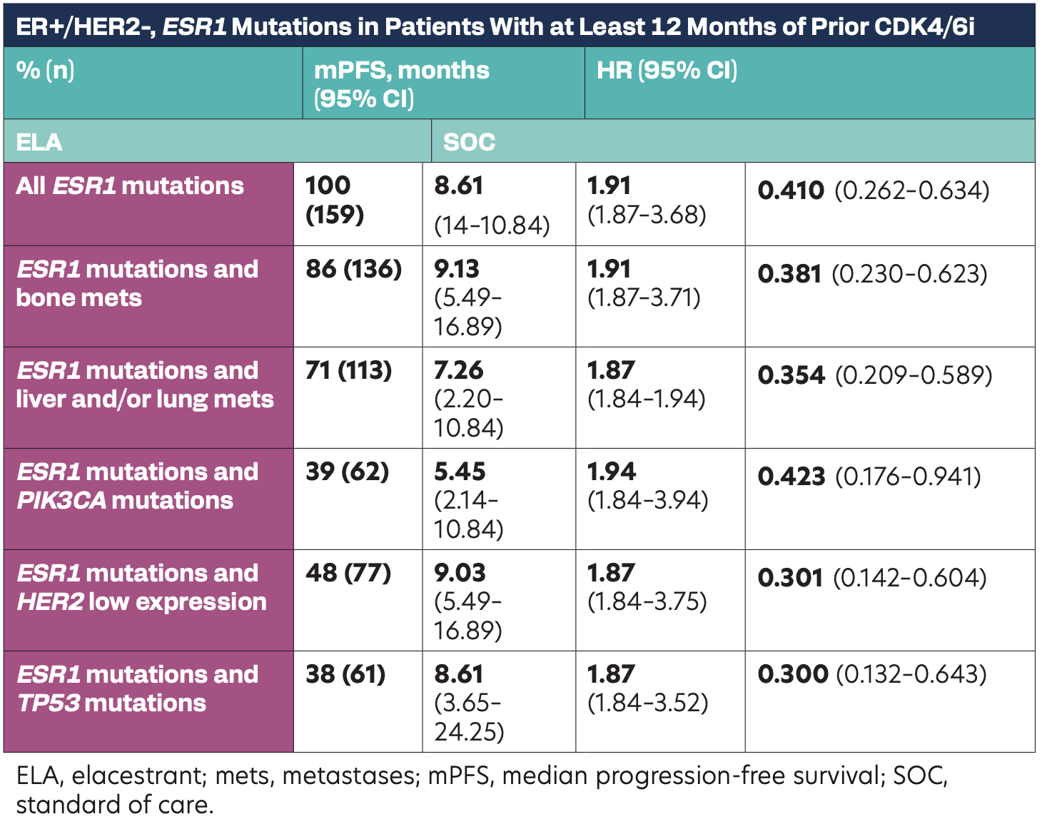 Elacestrant was associated with a clinically meaningful improvement in PFS that was consistent across all relevant subgroups in patients with ESR1 mutation. These results demonstrate that when patients with ESR1 mutations remain endocrine sensitive (prior CDK4/6 inhibitors duration of at least 12 months), the ER pathway could be the main driver of disease despite the presence of other resistance mechanisms, and regardless of the metastases site or coexistence of PIK3CA mutation, TP53 mutation, or HER2-low expression. Single-agent elacestrant enables ET sequencing in the second line before other targeted therapies, drug combinations, and chemotherapy-based regimens, including antibody-drug conjugates.
