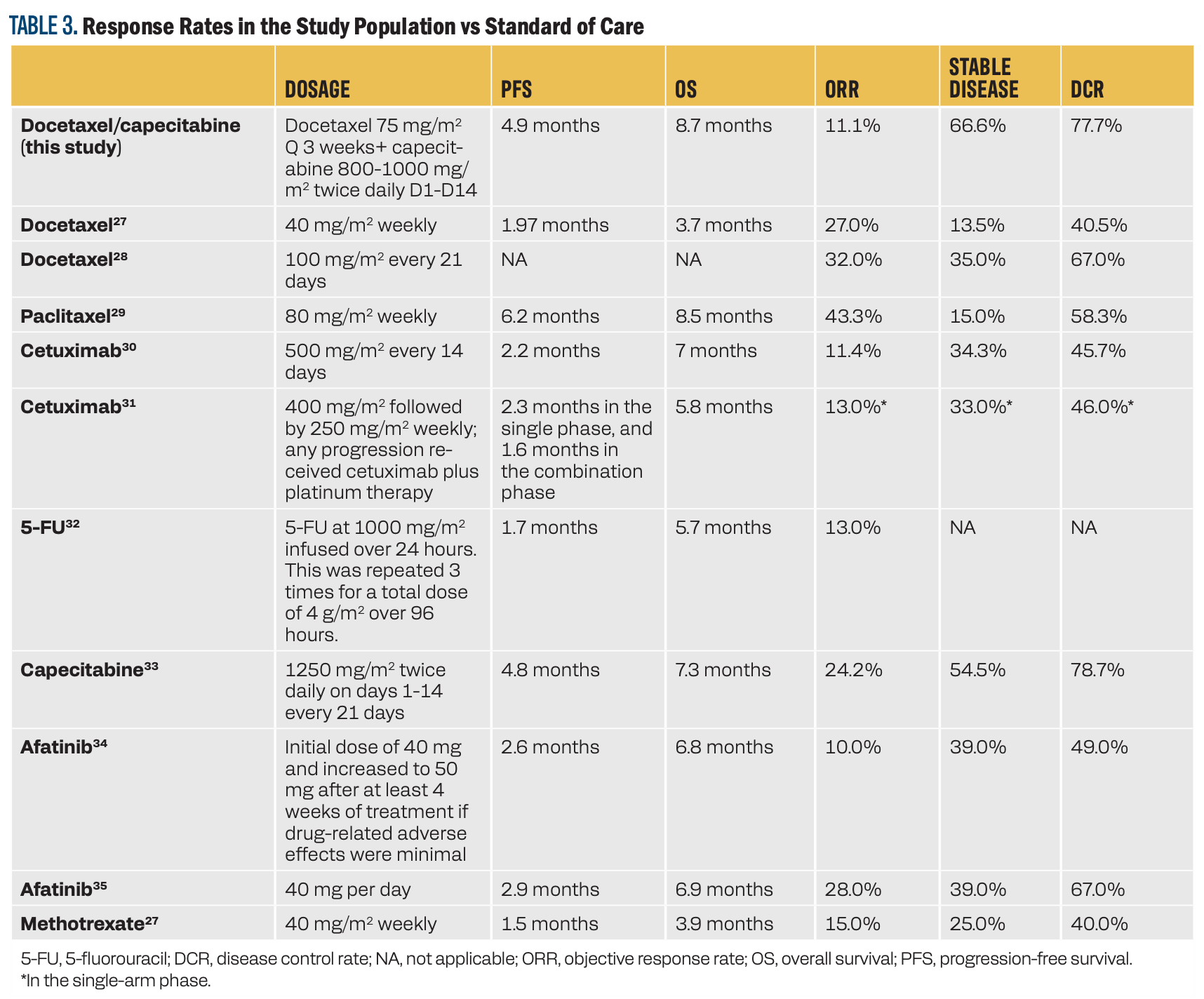 In this study, the combination of docetaxel and capecitabine resulted in a 77.7% DSR and 11% ORR. In addition, it led to a PFS of 4.9 months and an OS of 8.7 months. Table 3 compares the response rates, PFS, and OS of this combination vs the current standard-of-care, second-line, and third-line treatment options.