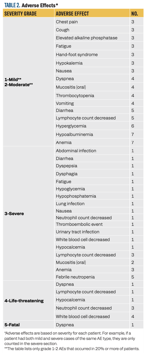 It is worth noting that we did not observe any grade 3 or greater hand-foot syndrome (HFS) reactions with this combination; however, HFS did occur in 3 patients (21%; grades 1/2). The most common (defined as ≥ 20%) grade 1/2 AEs and all grades 3 to 5 AEs are summarized in Table 2.