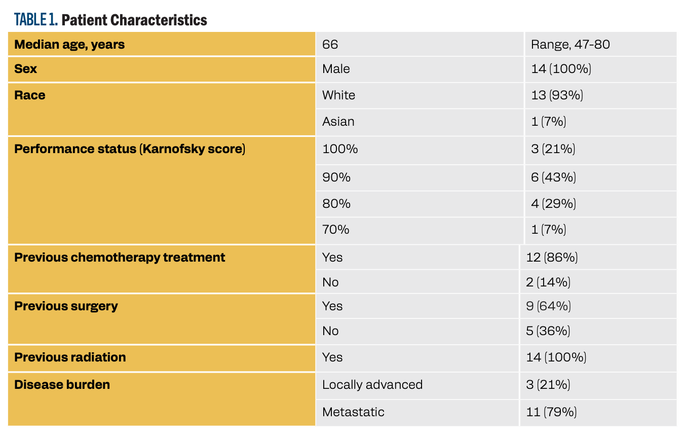 This trial was terminated early due to CPIs being introduced as standard of care.A total of 14 patients enrolled in the study. The median age of the study population was 66 years. Patients’ demographics are summarized in Table 1.