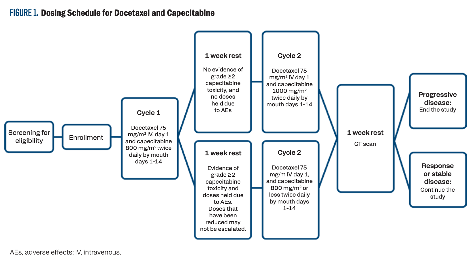 Current evidence suggests that if the 2 agents are used in combination, docetaxel should be started at a higher dose, and capecitabine should be started at a dose lower than its maximum tolerated dose. If AEs develop, the docetaxel dose should be decreased.26