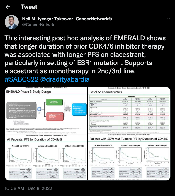 The first trial Iyengar covered was the phase 3 EMERALD study (NCT03778931), which “supports elacestrant as monotherapy in 2nd/3rd line” for patients with ER-positive/HER2-negative breast cancer, Iyengar wrote during the takeover.