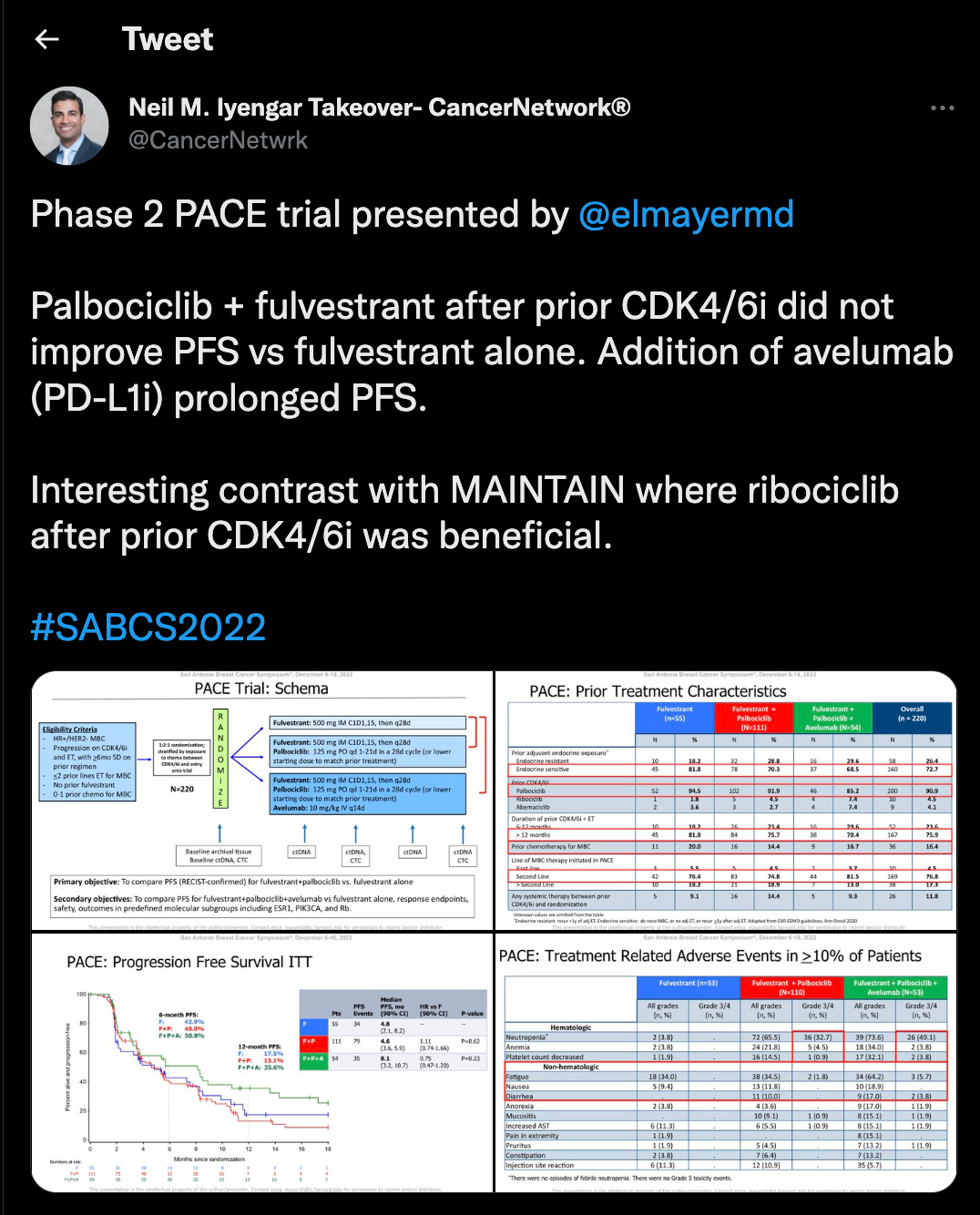 Finally, results from the phase 2 PACE trial (NCT03147287) were discussed at the meeting, as well as in Iyengar’s takeover. In the trial, palbociclib (Ibrance) and fulvestrant were found to not improve efficacy over fulvestrant alone for patients with ER–positive/HER2 negative breast cancer. Iyengar noted that the addition of the PD-L1 inhibitor avelumab (Bavencio) helped to prolong PFS.