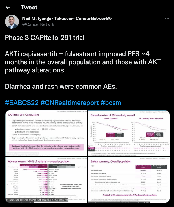 Data from the phase 3 CAPItello trial (NCT04305496) indicated that capivasertib plus fulvestrant vs placebo were found to improve PFS for patients with hormone receptor–positive/HER2-negative advanced breast cancer, including those with AKT pathway–altered tumors. Iyengar highlighted the regimen’s safety profile during the trial during his takeover, noting that diarrhea and rash were common AEs in the study.