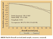 Patients with sequential endocrine treatment also had a significant improvement in overall survival (see figure). In the intent-to-treat analysis of all patients, deaths were significantly reduced by 22% (P = .032). Higher levels of estrogen receptor or progesterone receptor positivity were predictive of longer RFS and overall survival, the risks of which were reduced by approximately 35% with sequencing, Dr. Jakesz reported.