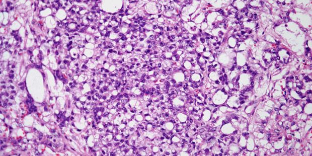 A 43-year-old woman presents with abdominal pain. A mass is found in her right side, and a biopsy is performed.