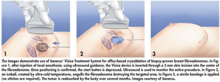 Cryoablation is already an FDA-approved treatment for fibroadenomas (see figure). In a multi-institutional series of 50 fibroadenoma patients, tumor volume decreased by 95% at 12 months, and there was resolution on imaging as well as physical examination (Kaufman et al: Am J Surg 184:394-400, 2002). In another study (Kaufman et al: J Am Coll Surg 198:914-923, 2004), the average treatment time for cryoablation of fibroadenomas was 24 minutes; 79% of procedures were performed in the office and 21% in the ambulatory operating room; and patient satisfaction was 94% at 12 months.