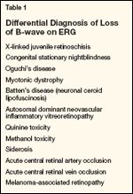 The most important clinical diagnostic test is the electroretinogram (ERG). ERG is a measure of the electrical response of the retina to varying stimuli of light, under dark-adapted, then light-adapted states. The a-wave represents photoreceptor function, and the b-wave represents inner retinal function, reflecting either Mller cell or bipolar cell function. The classic finding of MAR, as demonstrated by our patient (Figure 5), is the so-called “negative ERG” featuring a low b/a-wave ratio in the “maximal, combined rod and cone response.” This is seen with a markedly reduced b-wave and a normal dark-adapted a-wave, which in the right clinical scenario is pathognomonic for MAR. The loss of the b-wave is due to an autoimmune response involving antigens located within the bipolar layer. Selective b-wave loss on ERG is also seen in congenital stationary night blindness, and a number of other inherited and noninherited toxic states (Table 1).