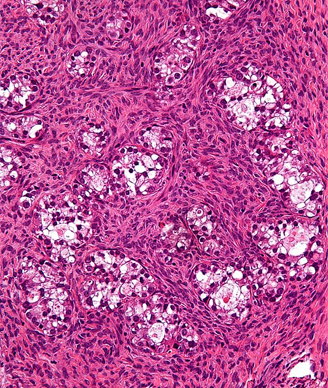 High magnification micrograph of an ovarian clear cell carcinoma. Copyright 2011 Nephron.