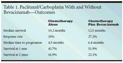 ORLANDO, Florida-Bevacizumab(Avastin) combined with chemotherapyextends survival in advanced,nonsquamous, non-small-celllung cancer (NSCLC), results of a randomized,multisite trial that tested thecombination as first-line therapy show.The findings are expected to changethe standard of care, said the investigatorswho presented their findingsat the 41st annual meeting of theAmerican Society of Clinical Oncology(ASCO) (abstract LBA4).New Standard of CareBevacizumab with carboplatin andpaclitaxel "is now the ECOG referencestandard for the first-line treatment ofadvanced nonsquamous NSCLC," saidAlan Sandler, MD, associate professorof medicine at Vanderbilt-IngramCancer Center, who led the trial forthe Eastern Cooperative OncologyGroup (ECOG).The trial enrolled 878 patients withstage IIIb or IV disease and randomizedthem to one of two arms. Onearm received paclitaxel at 200 mg/m2and carboplatin to an AUC of 6 on day1 every 3 weeks for six cycles, while theother arm received these two drugsplus bevacizumab at 15 mg/kg on day1 for six cycles, followed by bevacizumabalone until disease progressionor intolerable toxicity. Patients withsquamous cell carcinoma were notincluded in the trial because the risk ofserious hemorrhage with bevacizumabis greater in this group.Better OutcomesPatients in the bevacizumab armhad significantly better outcomes.Median survival in this group was 12.5months, vs 10.2 months for the groupthat received chemotherapy alone. Theresponse rate in the bevacizumabgroup was 27.2%, vs 10% for the controlgroup. Median time to progressionwas 6.4 months vs 4.5 months,respectively.
