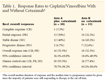 A monoclonal antibody, cetuximabtargets the HER1/epidermal growthfactor receptor (HER1/EGFR), whichis highly expressed in most advancedcases of NSCLC. It has shown synergisticactivity with cisplatin and vi-norelbine in laboratory tumor models,according to the investigators.Inclusion criteria included diagnosisof histologically confirmed stageIIIB or IV NSCLC with documentedmalignant pleural effusion, immunohistologicalevidence of EGFR-expressionin the primary tumor, and at leastone metastasis and Karnofsky performancestatus ≥ 70. Patients with previouschemotherapy, monoclonal antibodyexposure, or EGFR targetingtherapy were excluded.All patients received a standardregimen of 80 mg/m2 of cisplatin and25 mg/m2 of vinorelbine on days 1 and8 in 3-week cycles. Half the patientsalso received an initial infusion of400 mg/m2 of cetuximab followed by250 mg/m2 weekly. Response is assessedevery two cycles by CT scanuntil progression.